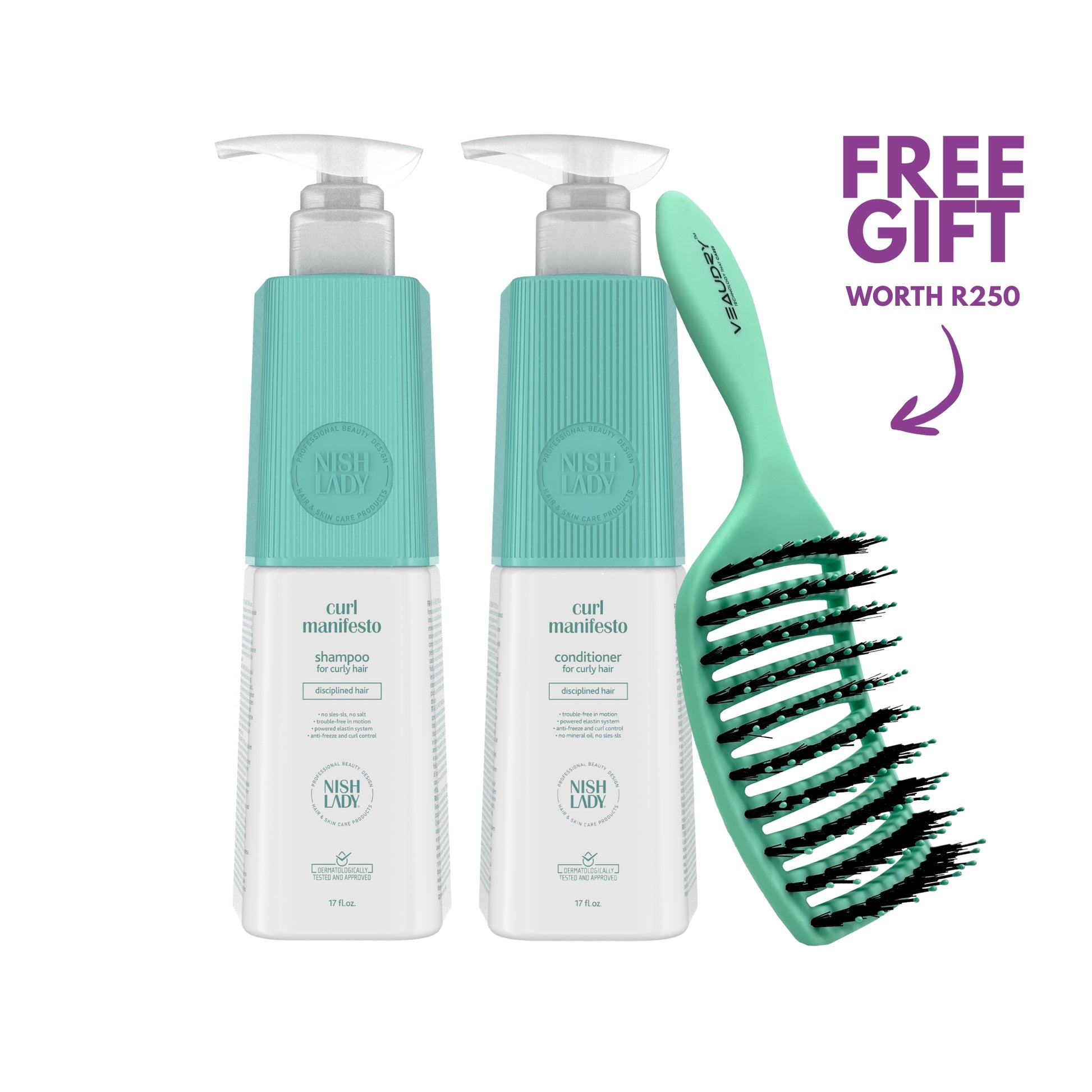 Complete your ritual with a Free Teal Veaudry MyDetangler Brush, designed to glide through curls without breakage — leaving your hair soft, defined, and completely Nish.